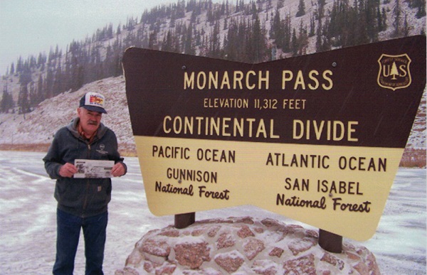 JD and Joan Shipman of Webster recently traveled over the Monarch Pass. JD braved the snow and wind to hold "The Quill" at the sign on the Continental Divide. Monarch Pass is a high mountain pass at an elevation of 3.448 miles (or as you see by the sign, 11,312 feet) above sea level, located in Chaffee County in the Rocky Mountains of south-central Colorado U.S.A..