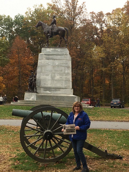 Susan is holding the October 2, 2019 edition of "The Quill" featuring the recent Civil War Reenactment event in Oquawka.
