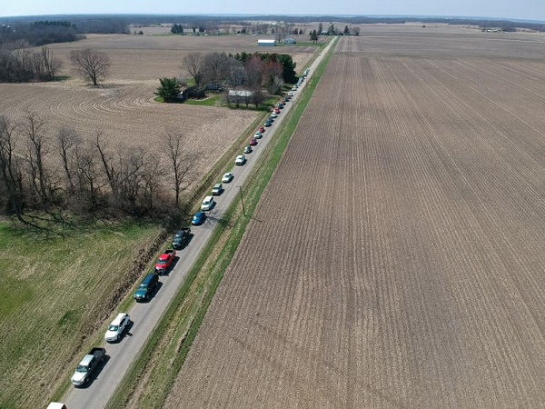 Missy went into the hospital with upper respiratory symptoms and sepsis which eventually shut down her organs. The COVID-19 test came back negative and the virus was not the cause, doctors said, but because of the COVID-19 outbreak, public visitations can not be held. But, Anita Smith, had a suggestion for a surprise drive-by at 2:00 p.m. on Palm Sunday to show their support. With the help of Dean and Jenny Clark, Hannah Allaman and several of the congregation, around 55 vehicles of well-wishes arrived, showing their respect and love, to let Pastor know they care and are there for him. He and his family were lined up outside their home next to the church and definitely felt the love and were overwhelmed by the showing and concern. Below is their picture taken with a Drone by Nicholas Defenbaugh and Luke Kinneer.