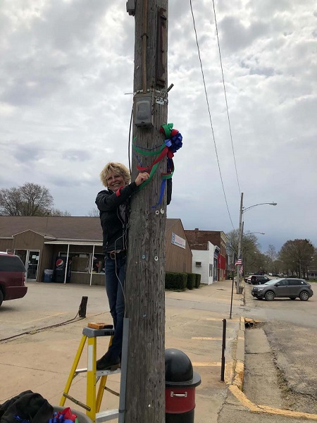 Diane Beals is hanging a ribbon on one of the ten light poles that were decorated on Broadway Street in Stronghurst, last Wednesday. Not pictured, but also helping was Jim Blender, owner of Bygones & Buds.