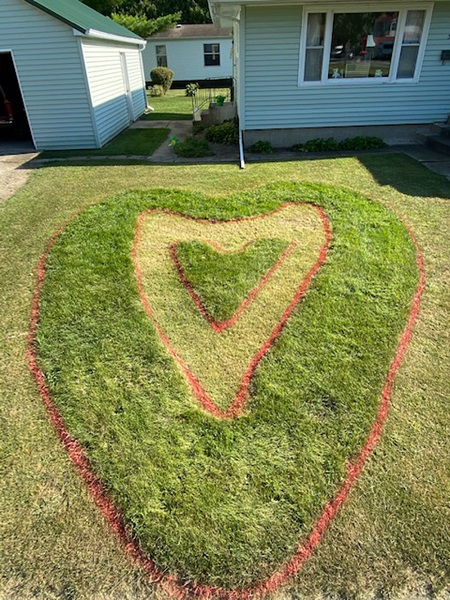 "You Gotta Have Heart!" as the song by Van Buren goes "Can't Sit Around and Mope" That is exactly what Jerry Quigle of La Harpe did. While he was doing his customary mowing, he decided to try the idea he saw on TV and mow hearts into his front yard. He said, "I see people go by and smile. It's what they need this year!" Jerry added., "and that makes me smile."