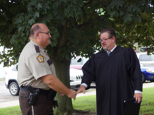 On Wednesday, July 1, a group of friends, relatives and co-workers gathered on the lawn of the Henderson County Courthouse in Oquawka to witness the swearing in of a new sheriff after the retirement of Steven P. Haynes which was effective June 30th.