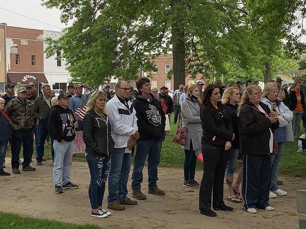 A large crowd gathered at the Hancock County courthouse May 19, just before the regular Hancock County Board meeting, encouraging the board to allow more businesses to open.