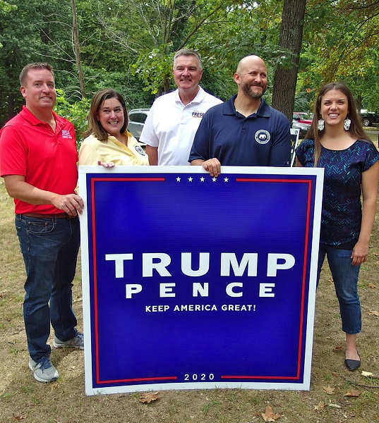 Henderson County Republican Precinct Chair Jon Riley of Stronghurst gives a big smile as he holds the sign in support of Trump/Pence Keep America Great at their annual Republican Family Picnic and Reunion held Sunday, August 30 at Delabar State Park. He stands along side (from left) Attorney Andy Doyle for Circuit Judge, Congressman Jil Tracy, State Representative Randy Frese, (Jon Riley) and Esther Joy King, candidate for U.S. Congress.
