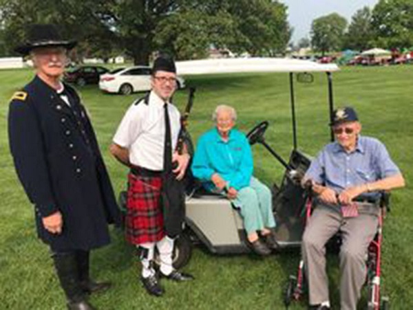 Glen was born August 10, 1923, and he served as first crew in the United States Navy during WWII. Glen is pictured with his wife who is seated in the golf cart, along with two other fellow veterans who served America. Dan Gillett, far left, Vice President of the SE Iowa Civil War Roundtable, and a reenactor, is dressed as a Major in the Civil War.