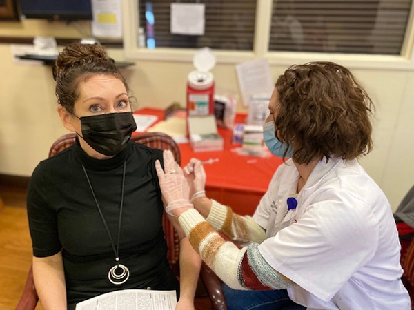 Administrator Valerie Adams volunteered to be the first one to get the shot administered by the Walgreen's staff who had arrived early at Oak Lane to give the first dose of the vaccine and to take care of the needed paperwork that goes along with it.