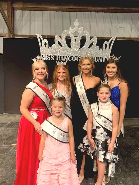 New 2021 Miss Hancock County Fair Queens who were crowned last Wed., July 21 in front of a full tent are from left: Miss Brynna Hughes; Little Miss Brielle Heidbreder and Jr Miss Kennedy Artman. Retiring 2019-2020 Queens are: Miss Alivia Lantz, Jr. Miss Sierra Lucie, and Little Miss Delaney Smith.