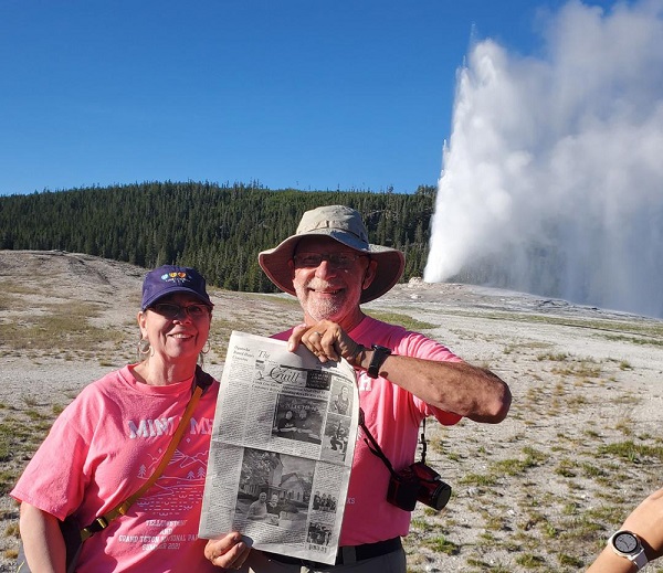 Ginnie and Curt Swarm of Mt. Pleasant, Iowa took "The Quill" along to the famous hot springs geiser, Old Faithful in Yellowstone National Park this month as they vacationed in the west. When you go on a trip, take "The Quill" along and have your picture taken with it and send it to us. Let's see where all "The Quill" can travel.