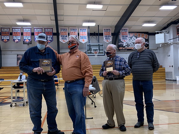 From left, retiring Illini West bus driver Dale Schamberger, (with board president John Huston), and retiring bus drivers Lee Unger and Darrell Kraft were recognized and thanked.