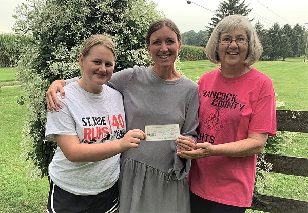 Tess Swearingen, childhood cancer survivor and Mollie Shepherdson of St. Jude, accept a $15,680 donation from Joy Swearingen, HCFC board member.