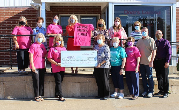 The group of volunteers on the left are Hancock County Fight Cancer (HCFC) members giving a generous check of $23,520 to the very appreciative HUGS board members on the right side. HUGS is a not-for-profit organization that gives financial and emotional support to cancer patients from Hancock County.