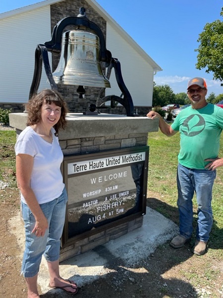 Terre Haute United Methodist Church Welcomes folks to their Sunday Worship at 8:30 a.m. and to Thursday's annual FISH FRY this Thursday, August 4th at 5 p.m. after Covid had interrupted their annual event that gathers friends around the community from far and near. James Mohr and his sister Annetta Ziegler stand with the newly erected marquee and bell in memory of their parents, the late Lowell and Jane Mohr.