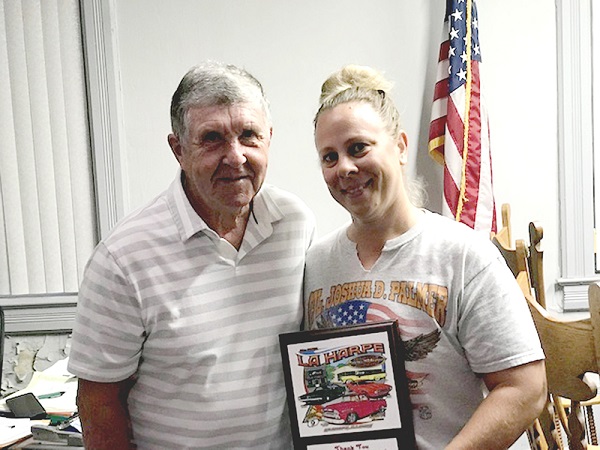 Former La Harpe Mayor Kenny Brown who organized the first car show with Jerry Burford and other locals, presents Mayor Kat Hasten-Reed (above) and The La Harpe City Council a plaque of Appreciation for all the city's support in helping with the 23rd Annual La Harpe Classic Car Show & Reunion. He also presented Mike and Dessa Rodeffer with a plaque of Appreciation for The Quill's newspaper coverage and support. All funds raised from the car show goes to support the Veterans Honor Flight to Washington D.C.. -photo by Mike Rodeffer/The Quill