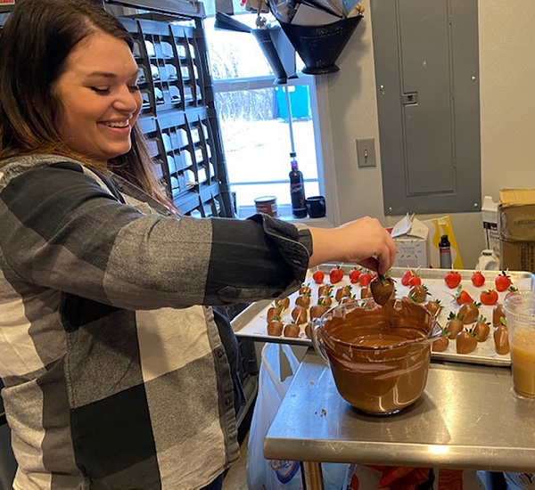 Mackenzie Meyer Crooks is dipping strawberries into chocolate for Valentines Day. Not just a few, but the business had over 100 dozen strawberries to dip in chocolate to have ready for customers in time for Valentines Day. The strawberries were beautifully decorated, boxed by the dozen for $15. and yes, delicious! Other gifts and food items along with fresh ground inhouse coffee drinks, available through a drive-up window.