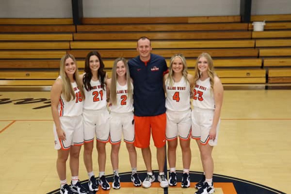 Five Senior girls on the Illini West Varsiity squad were honored during their final home game Wednesday, February 9th. From left is #15 Hallie Ray #21 Marie DeSotel, #2 Caydee Kirkham, Illini West Girls Varsity Head Coach Grant Surprenant, #4 Madi Cole, and #23 Abbie Johnson.