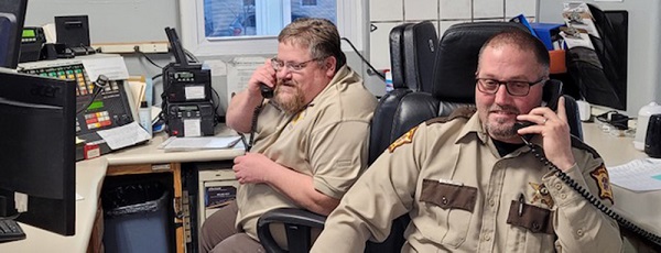 From left, Henderson County Dispatcher Troy Jern and Chief Deputy Matt Link check the landline phones at the Henderson County Sheriff's office in preparation for the 911-System to be implemented soon in Henderson County.