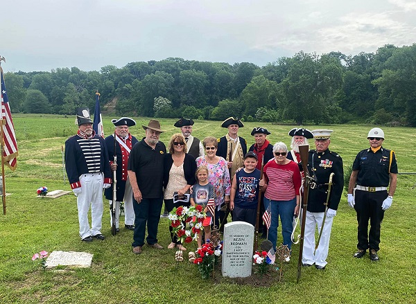 Back row left: Mike Rowley (Clive, IA), Gary W. Miller, Commander AL Kewanee 875 SAR Neponset, and Adrian Miller, Douglas Holmes SAR (Zeally Moss Chapter), Adrian Michael Tubbs (Washington) military retired, Dave Nation Veteran USAF Intelligence (Cedar Falls, IA), Colonel Gary Miller Ret USMC AL 136 and Dept. Commander, and Scott Spitzer, Vietnam Veteran US Navy, Honor Guard Commander AL 136. Rezin Redman descendants who attended from left front: Jerry Freeland (Burlington, IA), Tara Harrison (Warsaw), Tatum VanAurdall, Dyna Freeland Scanlan (Dallas City), Avery Huss and his grandmother Jean Ann (Freeland) Thomes, Dallas City. Her great great grandmother Nancy Freeland was married to Rezin Redmann until he died in 1837. Nancy Redman Freeland is buried in Freeland Cemetery.
