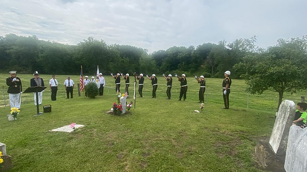 At the closing of the ceremony honoring Col. Rezin Redman who was buried at Freeland Cemetery, 408 Crane Hill, Lomax, IL, veterans of the Monmouth American Legion (AL) conducted a 21 gun salute and taps to end the program. From left is: Monmouth AL Post 136 Commander Colonel Gary Miller, Retired USMC, Mike Rowley SAR, Dan Gillett Vietnam Veteran US Army of La Harpe AL, Monmouth American Legion 136 color guard in white and honor guard in blue: Mark Todd AL 136, J.R. Lafferty SAR and AL 189 Alexis, and from AL 136 Don Wells, Edward Martern; and Bill Hruby, John Millar, Steve Hall, Scott Mast, David E Peterson, Jr., Mike Conard, Dick Clark and Honor Guard Commander Scott Spitzer USN.
