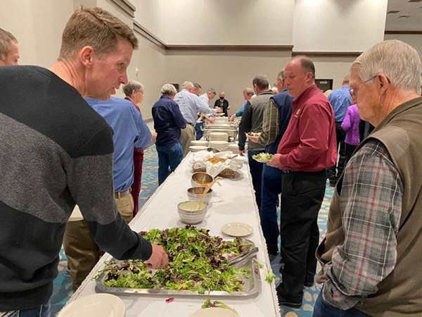 Lunch was offered of salad, rolls, potatoes, gravy, ham, roast beef, green beans, dessert, drink in a pleasant atmosphere with many attending. From left to right is Matt Defenbaugh, John Wolf and Bruce Wolf and others getting their meal after the business meeting.