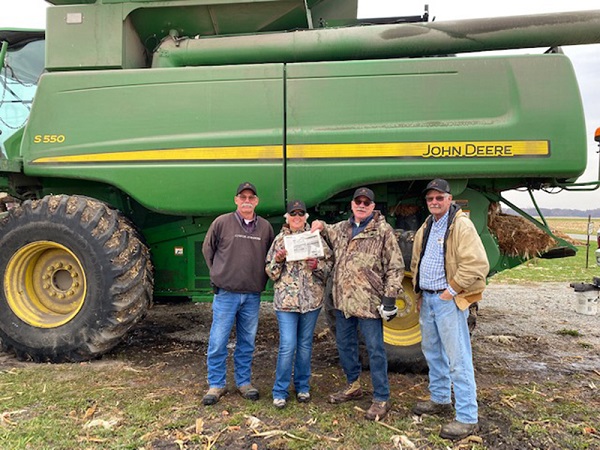 Mike and Lisa Bice of Tulsa, Oklahoma recently came for a week's visit to Mike's cousin's and his wife, Michael and Dessa Rodeffer of Stronghurst to experience and help with the fall harvest of corn and soybeans in the Burnside, La Harpe and Stronghurst areas. Lisa made sure she took "The Quill" along to capture the fun experience with Michael and his good helper David Anderson who runs the combine. They were up early and worked until after dark helping out wherever they could for the week. Lisa drove a truck, hauling grain to the Burnside elevator and Mike drove the tractor pulling the auger wagon. From left is Dave Anderson, Lisa and Mike Bice, and Michael Rodeffer.