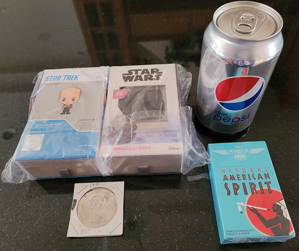 In front of the south monument was a package containing a boxed Star Wars coin, a boxed Star Trek coin, a silver 1971 Commonwealth of the Bahama Islands coin, and a receipt for the Star Wars and Star Trek coins, with price listed as $99 each. The name, address and phone number of the purchaser were also on the receipt.