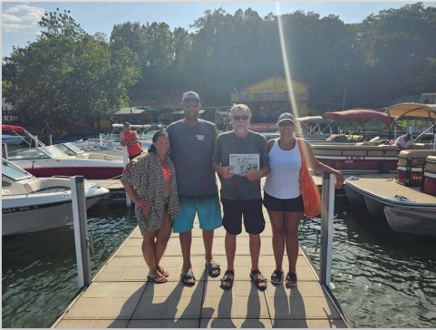 Marvin and Barb Linder, of Carman, took "The Quill" along on their annual vacation to Osage Beach, Missouri where they enjoyed boating and riding sea doos. While there they enjoyed outdoor music, food and drinks at The Fish and Company Restaurant with daughter Cassie and Jay Burton of Keokuk, Iowa.