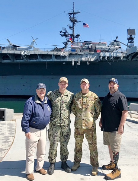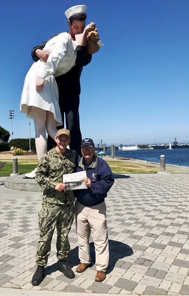 The Quill traveled to San Diego the last week of June with Larry Louden of Hot Springs, Arkansas (formerly of the Hancock-Henderson County area, and sons Jeff and Ben. The purpose of the trip was for Lt Col Ben Louden to administer the reenlistment oath to his nephew Navy IT2 Christian Louden with the USS Midway in the background. All four Louden men posed together in front of the ship, and later, grandpa Larry posed with the Quill and Christian in front of the “Kissing Sailor”statue.