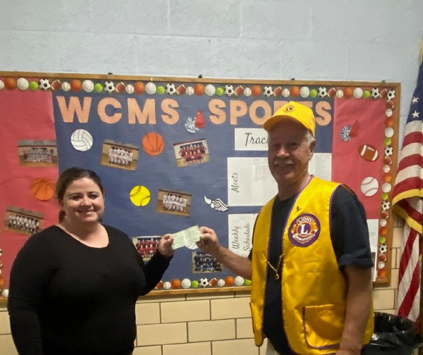 On behalf of the Stronghurst Lions, David Knutstrom presented Alyssa Hawk, West Central Middle School secretary, a $500.00 check to be used to support the West Central boys and girls summer youth ball programs.