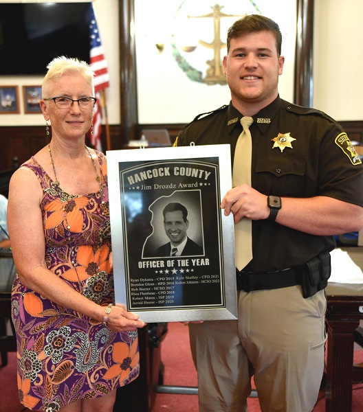 Kolton Johnson of Hamilton was awarded the Jim Drozdz Officer of the Year award during the Hancock County board meeting June 20.