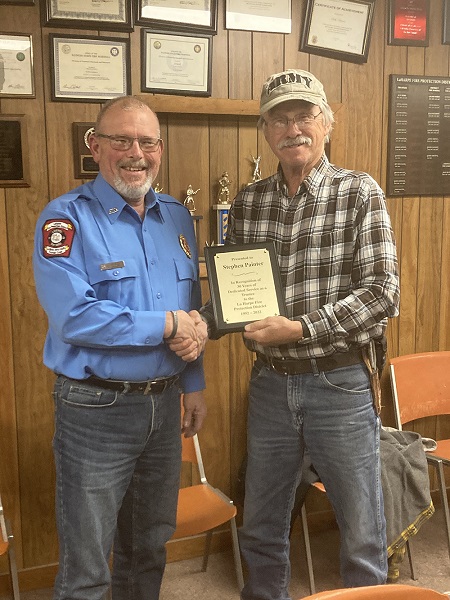 La Harpe Fire District Chief Jerry Brown (left) is presenting Stephen Painter a 30 year service plaque as La Harpe Fire District trustee and secretary and said it came with "much appreciation for a job well done." He also presented him with a 50 year plaque in recognition of his service as a fireman.