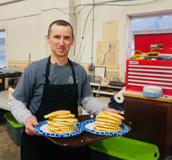 MST Fireman Kevin Box bringing out hot pancakes to keep up with the hungry crowd Saturday evening in Stronghurst.