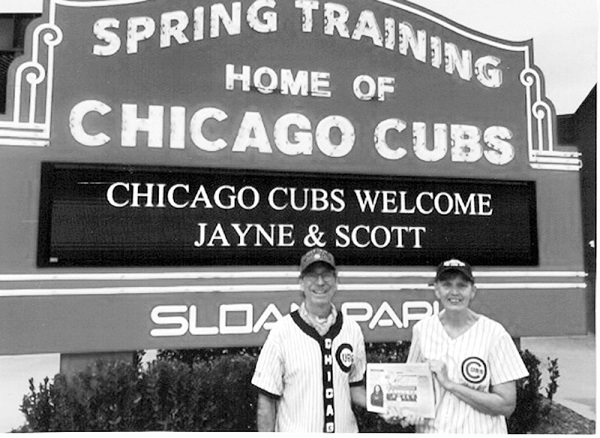 Scott and Jayne (Kralovec) Forwood of Payette, Idaho took ‘The Quill’ along with them to Mesa, Arizona. On March 14th they attended their first Chicago Cubs spring training game. It was a fun way to celebrate their 40th wedding anniversary. The Cubs lost that night to the Rockies, but a good game was played. Plus it was fun meeting people from Illinois, Iowa, and other states. Jayne is a former resident of La Harpe.