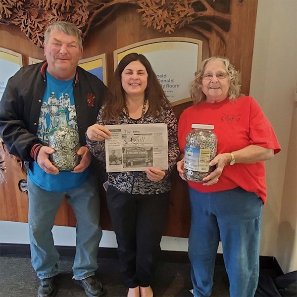 Tom and Jean Crotts took "The Quill" along March 16th and two gallons of pop tabs to Iowa City and donated them to the Ronald McDonald House in honor of their great-granddaughter Ellyana J'Lynn Majors getting her permanent pacemaker placed in her heart on Feb. 17th. Elli is the daughter of Jacqueline McGraw of Stronghurst and celebrated her 7th birthday in April. Pictured is Tom and Jean with Susan, an employee of the McDonald's House holding The Quill.