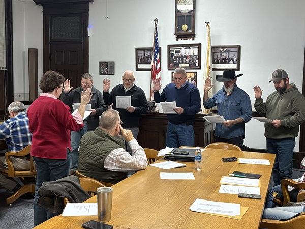 County Clerk Holly Wilde-Tillman is installing new and re-elected county board members. From left are Josh Turner, Mark Menn, Joe Boyles, Steve Lucie, and Alex Blythe.