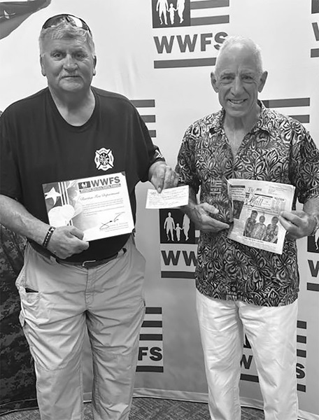 Pictured are Earl Waller presenting a check for $11,500 to Col. John Folsom, founder of WWFS. Also the second picture shows Earl & Col. Folsom holding a Thank You certificate, crystal thank you award, and Col. Folsom holding The Quill. Col. Folsom kept The Quill as it was the June 26th edition featuring the article of the tournament. He and the staff thoroughly enjoyed reading it!
