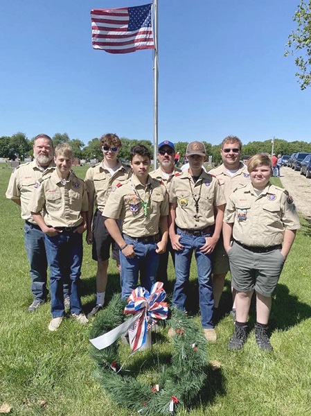 5 Boy Scouts and 3 leaders who took part in the moving Memorial Day ceremony at the Biggsville Cemetery. Scouts from left front: Michael Weber, Carson Davies, Ryan Jimenez-Stevens, Owen Weber and Lucien Hinton. Leaders from back left: Josh Hinton, Scout Master Matt Weber (center), and Trevor Davies (right).
