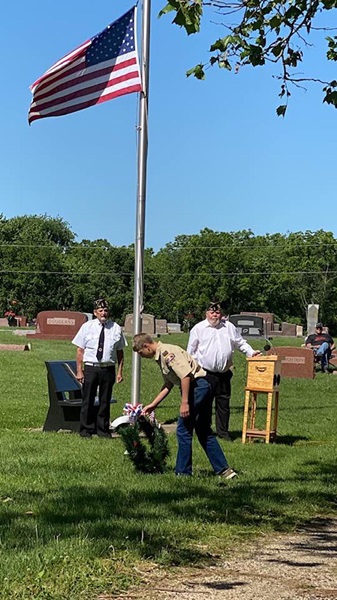 Biggsville American Legion Adjutant Robert Cravens and Commander Scott Rhinehart pause after Rhinehart's reading of each group of veterans who had served during various wars and conflicts and are buried at Biggsville, Reed, Rozetta, and South Henderson cemeteries while boy scouts from the Biggsville Post take turns placing a flag on a Memorial Wreath, then stand to salute America's military heroes.