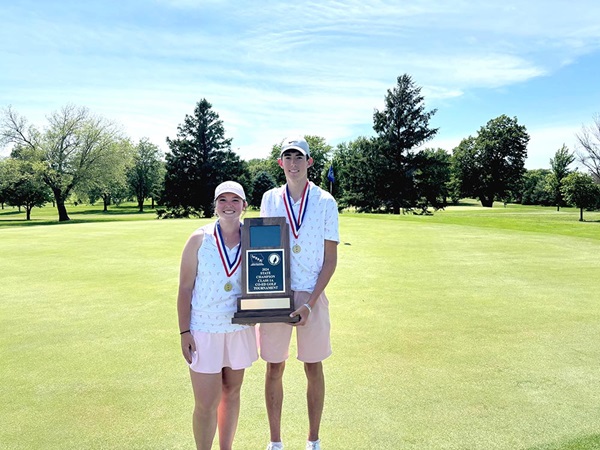 Olivia Hines of Mediapolis, Iowa (formerly Stronghurst) and her partner Ben Wolter, competed in The Iowa Coed State Class 1A Golf Tournament June 3rd and brought home the first place trophy for the Mediapolis Bulldogs.