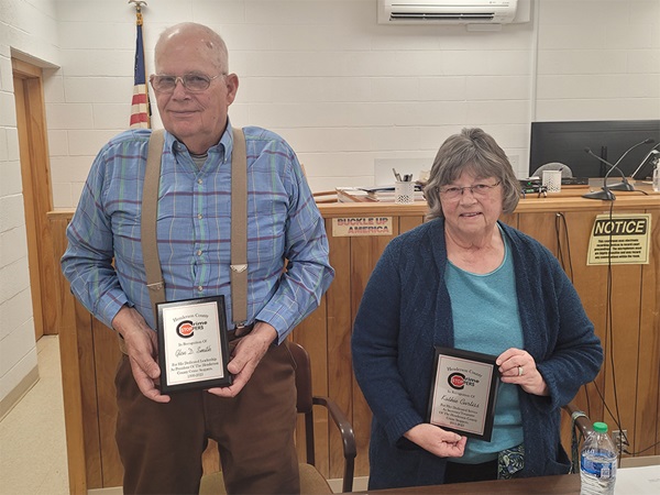 Glen Smith was awarded and recognized for his outstanding dedication to the Henderson County Crime Stoppers for serving as its president from 1999 to 2023, and Kathie Curtiss was awarded and recognized for her outstanding dedication for serving as secretary/treasurer from 2001-2023.