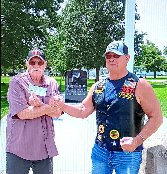 U.S. Veteran Bob Burr (right) of Lomax, presents a $500 check to La Harpe American Legion Post #301 Commander Harry Fark (left) on behalf of "The Combat Veterans Motorcycle Association of Northwestern Illinois." The generous gift goes into the La Harpe American Legion Memorial Fund – Post #301. Rod Burr presented the check on Sunday, May 19th in front of the newly installed La Harpe Veterans Memorial tablets which are to be dedicated this Monday, May 26, 10:00 a.m., during the La Harpe Memorial Day service at the La Harpe City Park or at the La Harpe Communitiy Building in case of rain.