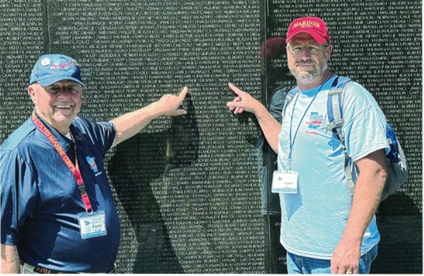U.S. Marine Veteran Terry Avery of Gladstone with his son U.S. Marine Veteran Scott Avery of near Peoria, point out Terry's cousin's name, (Milford "Don" Isaacson) on the Vietnam Veterans Memorial Wall when they traveled to Washington D.C. on Sept. 12th on the Great River Honor Flight.