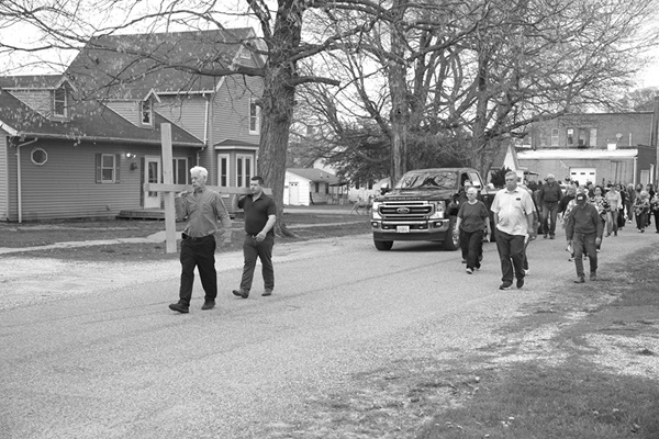 After the solemn Good Friday service at the Stronghurst Christian Church reminding of the last words of Jesus Christ, Son of God at his crucifixion, many remained to follow the cross in the 2nd Annual “Stations Of The Cross.” In Jerusalem, Stations of the Cross Walk is known as The Path Of Sorrow. Readings and group singing are part of each station. The walk continued on to the Presbyterian Church, the United Methodist Church, Oak Lane and Oak Wood Assisted Living, West Central School and ended at the Bethel Lutheran Church. Good Friday services is conducted by the Stronghurst Area Council of Churches. Pastor Steve Minkler of the Christian Church arranged the Stations Of the Cross program.