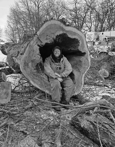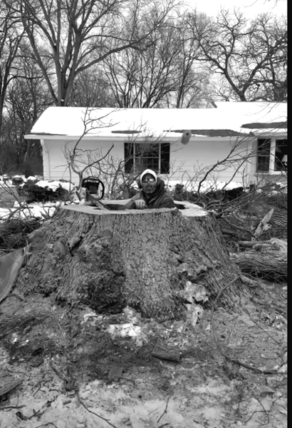 Kevin Shaw, having a little fun with his crew after dropping a big hollow Oak tree at Mike and Dessa Rodeffer's home at the edge of Stronghurst last Tuesday.