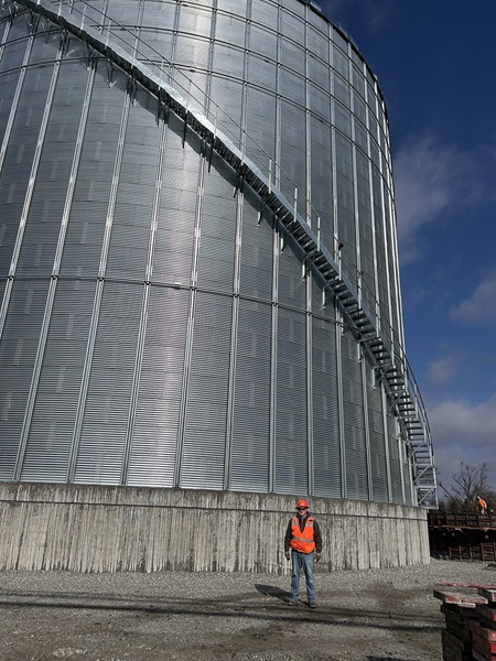 Pictured is the first bin that has been installed. It is 90 foot in diameter and will hold approximately 414,000 bushels. Three more bins, two 85,000 bushel bins and one 80,000 bushel bin, are to be installed.