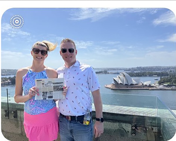 Kyle and Deanna (daughter of Dan and Martha Gillett of La Harpe) Schnaufer of Moseley, Virginia took “The Quill” along when they climbed 200 steps to the Sydney Bridge pylon lookout on a recent trip to Australia. They had a great view of the Sydney Opera House (in the background). They were able to attend the opera the following Monday evening before traveling on to New Zealand. Kyle’s company, D.R. Horton, took several of the executives on this wonderful vacation where Deanna was able to hold a Koala and pet a young Kangaroo.