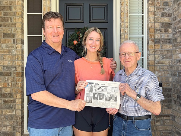 Haven Noble of Mt. Pleasant, IA traveled to the Dallas area to visit his son and granddaughter for a few days. Haven remembered to take a copy of “The Quill” along for a quick photo in front of their home.