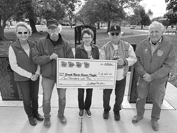 Last week in front of the Veterans Memorial in the La Harpe City Park, the La Harpe Car Show Committee handed a $2000 check to representatives of the Great River Honor Flight of Quincy.