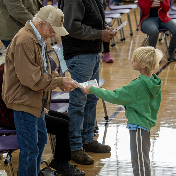Pre-K and kindergarten students led the Pledge of Allegiance; the La Harpe Junior High Choir sang "God Bless America"; second graders presented cards to veterans; fourth graders discussed military branches and Veterans Day history; first graders performed a thank-you skit; the Dallas City Junior High Choir sang "We Say Thank You"; junior high students handed out thank-you cards; and the La Harpe Junior High Band played "Armed Forces Tribute."