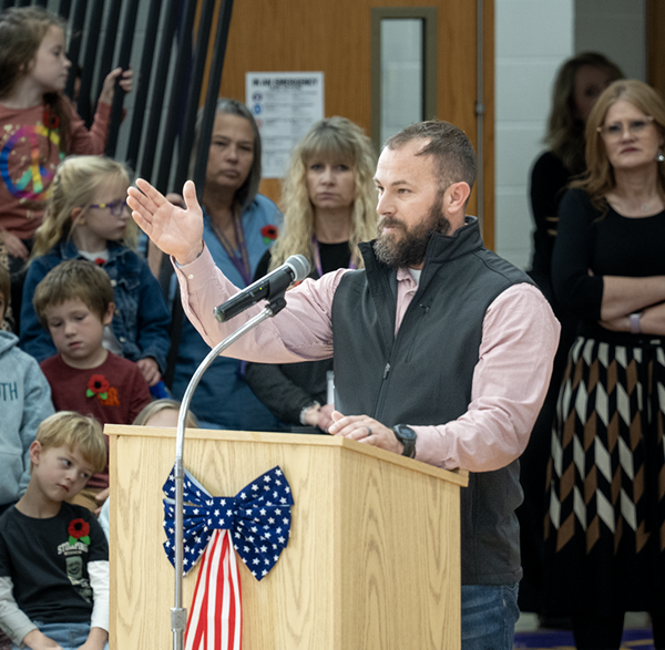 Joshua Higgins, E-5 US Air Force,speaking at the WCMS Veterans Day Program.